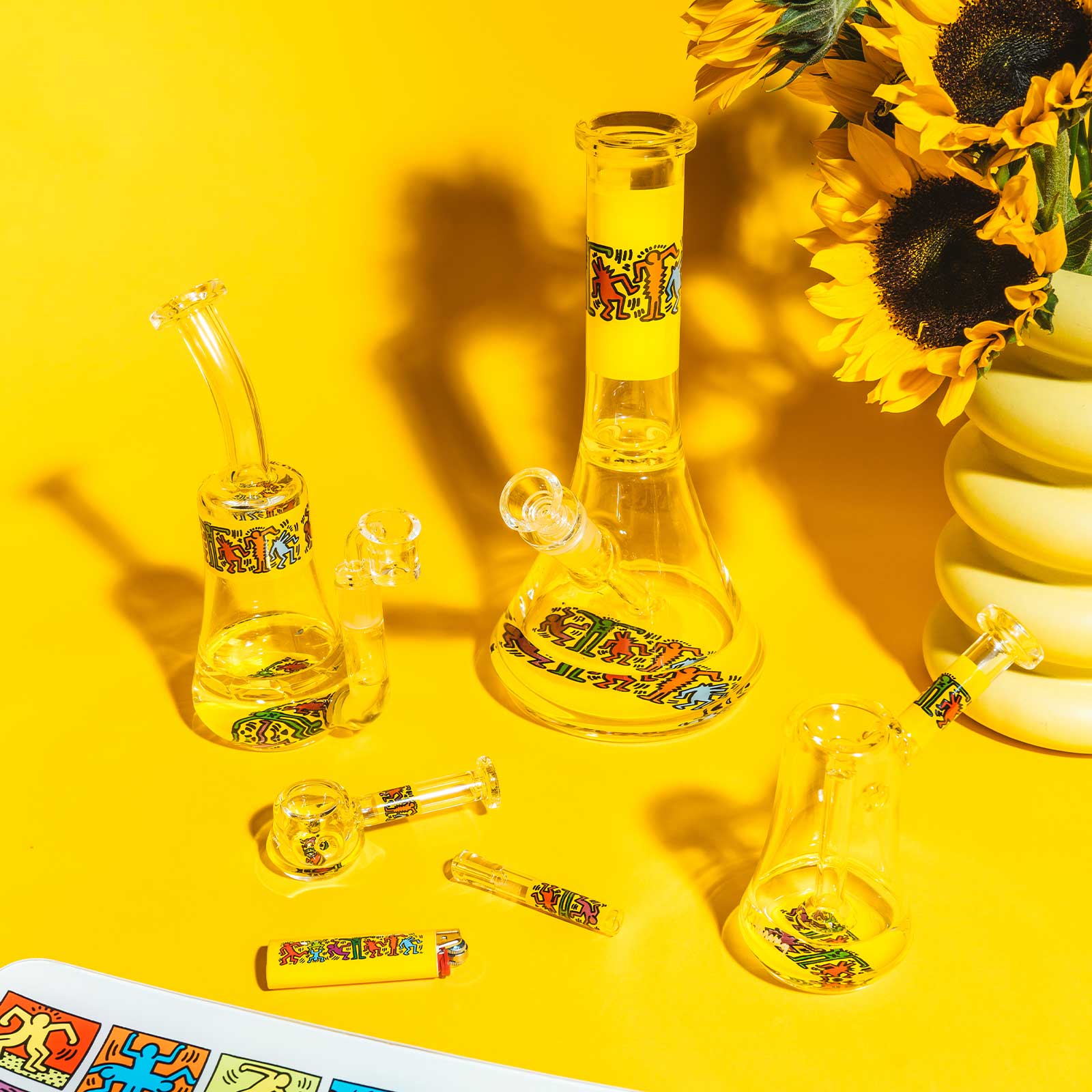 Deze kleurrijke glazen pijpen zijn verkrijgbaar in verschillende varianten, zoals Yellow en Multi-blue, die allemaal verschillende klassieke figuren en ontwerpen van Keith Haring laten zien.
